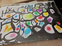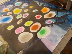 国語の時間、物語教材で学習している「モチモチの木」の絵を図工の時間描いていました。暗闇の中で輝いてきれいなモチモチの木を表現することを工夫していました。