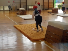 体育館で跳び箱運動に取り組んでいました。開脚跳びでピタッと止まりマット二着するように挑戦しています。
