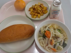 今日の給食は、小型玄米パン、発酵乳、地物たっぷりしのだうどん、さつまビーンズ、みかんでした。