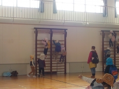 1年生の教室では緊張していたのか、そのあとの体育館の見学では肋木に上ったり、走り回ったりして心を開放している様子が見られました。