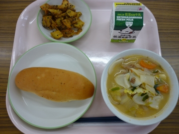 今日の給食は、小型玄米パン、牛乳、キムチ鍋、大学いもでした。