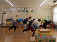やまびこ学級の子どもたちは、2番目に「まねっこ体操」を行い、前でポーズをとったこの真似をしながら発表しました。