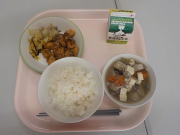 今日の給食は、米飯、牛乳、あじの香味あげ、こんぶあえ、のっぺい汁でした。のっぺい汁には野菜がたくさん入っていて栄養たっぷりで体が暖かくなりました。