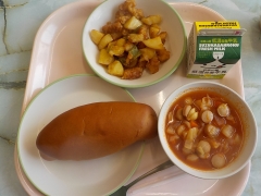 今日の給食は、黒糖パン、牛乳、いかと野菜のレモン風味あげ、ミネストローネでした。いかと野菜のレモン風味あげは、6年生の給食人気メニューの一つです。