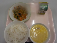 今日の給食は、米飯、牛乳、ポークカレー、チーズ入り海藻サラダ、お祝いクレープでした。