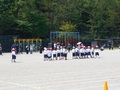 ゲームで体が温まったあとは、スタンディングスタートの練習に取り組みました。「手を膝に置いて」という合図で重心を前に傾け、素早く走り出す姿勢を学びます。子どもたちは何度も挑戦しながらスタートのコツをつかもうとしていました。