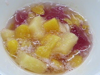 フルーツポンチは、ぶどうゼリー、パイン、黄桃を混ぜ合わせました。