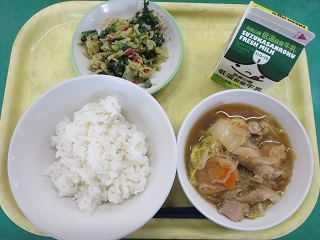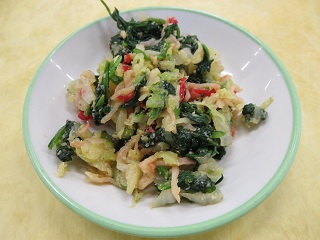 ごま酢あえは、キャベツ、ほうれん草、かまぼこを砂糖、しょうゆ、酢を混ぜて作ったたれで和えました。