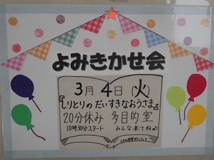 来週3月4日(火)には、本年度最後の「読み聞かせ会」も開催されます。子どもたちも楽しみにしていることと思います。どうぞよろしくお願いします。