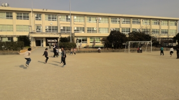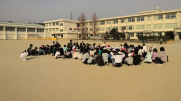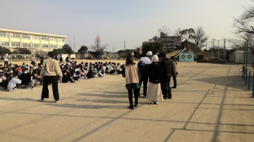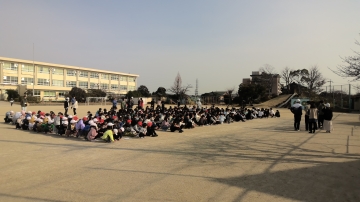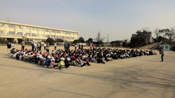 下の写真のように運動場で遊んでいた子たちもすぐに遊びをやめて運動場の中央に集まるなど、