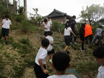本日2時間目にご協力いただいた方々をお招きして、なかよし山改修記念式を行いました。泊山小学校の「なかよし山」は、泊山小学校が開校した53年前に、当時のPTA役員や地域の方々が、子どもたちが楽しく遊べるように整備していただいた大切な山です。この「なかよし山」が長年の間に大雨などでけずられて、一部で土のうがむき出しになりつつありました。そこで、令和7年度に「学校環境緑化モデル事業」の対象となり、PTAと学校、泊山小学校コミュニティースクール運営協議会、地域の方々にご協力いただき、きれいによみがえりました。さらに、「日永梅林・登城山を復活させる会」の方々にもご協力いただき、南部丘陵公園にたくさん植えられている梅の木を、この「なかよし山」にも植えていただきました。梅は泊山小学校の校章にもなっていて、地域の人とのつながりを大切にするシンボルです。これからもみんなで大切にしていきます。