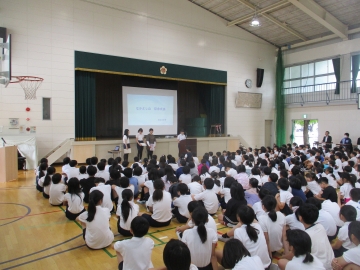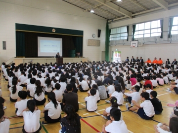 今日は、1限目に全体練習がありました。今年のスローガンについての話があり、全校で力を合わせて頑張っていくことを確かめました。そして、開会式や閉会式の流れを確認しながら練習をしました。来週に迫ってきた運動会に向けて、しっかりと取り組むことができていました。