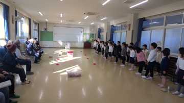 本日、1年生が生活科の授業で「昔遊び」体験を行いました。日頃、登下校の見守りでお世話になっている地域のボランティアや日永地区ついたち会(老人会)の