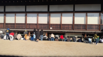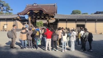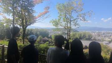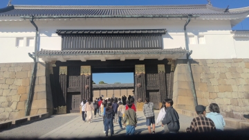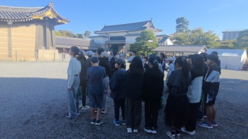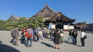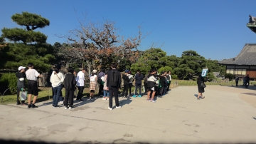 予定通り、二条城に着きました。バスの中ではすごく楽しく過ごし、全員元気です。京都の天気は晴れ、さわやかな秋空です。二の丸御殿を見学した後、庭からうぐいす張りの仕組みも見ることができました。