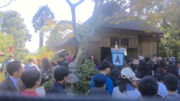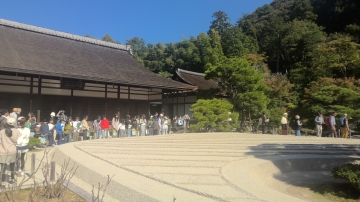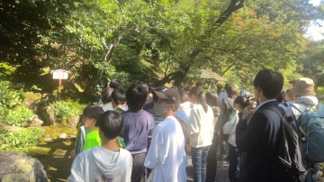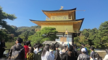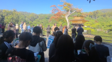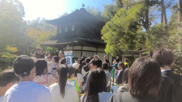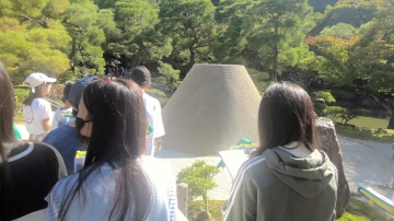 秋晴れに映える金閣を見学して、思わず「きれい!」という声が出ていました。美しい庭にある夕佳亭は落ち着いた雰囲気で、金閣とは違ったよさがありました。