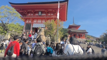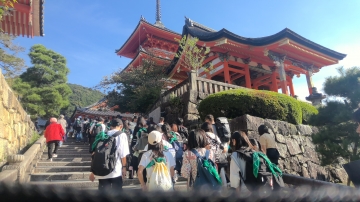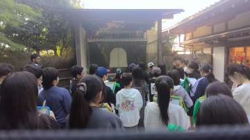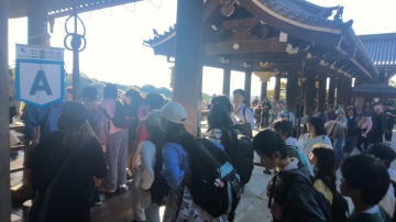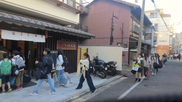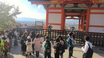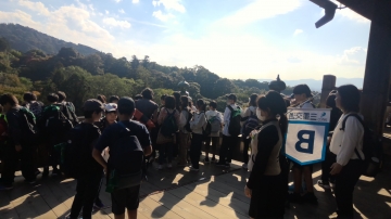 清水寺の見学とおみやげを買う班別分散行動を無事に終えて、旅館に向けて出発しました。清水寺の参道にはたくさんの観光客の方々がみえましたが、はぐれないようにすべての班が協力でき、時間通りに集合できました。すばらしいチームワークでした。