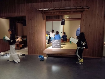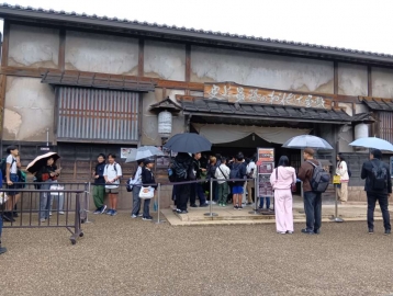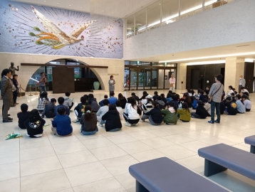 2日目最初の見学地は、立命館大学国際平和ミュージアムでした。ボランティアガイドさんたちの説明を聞きながら、班別分散学習で見学し、平和について深く考える機会となりました。雨もやんで映画村に向かって出発しました。