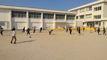 下の写真のように運動場で遊んでいた子たちもすぐに遊びをやめて運動場の中央に集まるなど、