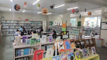 運動会も終わって、今日はどのクラスも大変落ち着いて学習するする姿が見られました。またより涼しくなって、休み時間にはなかよし山や運動場で元気に運動遊びをする姿も見られました。さて、秋はスポーツの秋などとも言われ、いろいろな活動がしやすい季節ですが、読書の秋でもあります。本校は、読書活動推進校の指定を受け、司書さんの派遣回数や本の購入金額が増えています。毎週火曜日には司書さんと図書ボランティアの方々が協力して、図書室などの読書環境整備も進めてもらっています。下の写真のように、図書室にはハロウィーンの飾りつけやおすすめの本の紹介コーナーがあり、1年生の教室横の廊下には読書コーナーがあり、たくさんの子が本に親しみ、貸し出し冊数も増えています。
