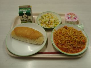 今日から給食が始まりました。1年生は入学して初めての給食です。メニューは「パン、牛乳、スパゲッティ、コーンサラダ、お祝いデザート」です。