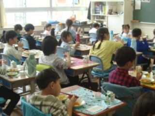 どのクラスも静かに前を向いて美味しそうに食べていました。「パンも牛乳もスパゲッティもサラダも全部美味しい!!」との声、デザートは最後に食べるようで、楽しみにしているようでした。