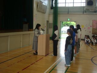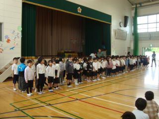 校長からは、2つの話「放送や先生の話をよく聞く」、「本番は練習のように、練習は本番のように」行動することを話しました。また、ハンカチは、煙予防やケガの処置にも役立つので、毎日持ってくることも話しました。