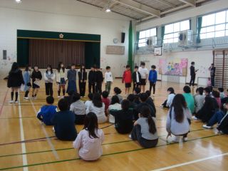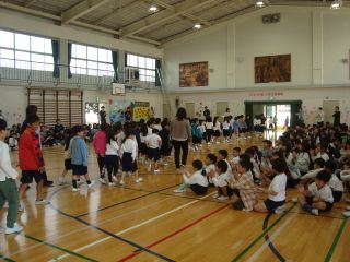 その後、1年生を迎える会を行いました。6年生の実行委員さんが、全校が楽しめる内容を考えてくれました。学校クイズや先生とのジャンケンでとても盛り上がり、1年生も嬉しそうに参加していました。