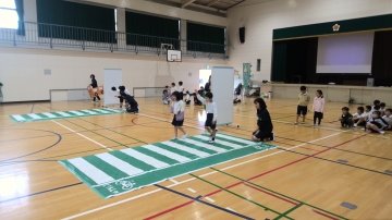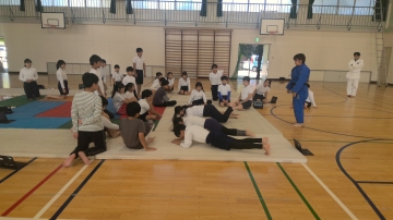 四日市市では各中学校区において、保・幼・小・中学校が連携する「学びの一体化」を進めており、南中学校区でも中学校の先生が小学校6年生に指導する「乗り入れ授業」行っています。今日は体育のマット運動にかかわる授業として柔道の授業をしていただきました。6年生の子どもたちは興味津々で、自分の身を守ることにもつながる「受け身」をマットの上で体験し、中学校の先生や授業を身近に感じることができていました。