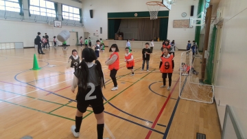 青、緑、赤、黄の4カ所)から同時にスタートして、5分間で走った距離を記録とします。10mごとに目印がおいてあるので、自分の記録がわかりやすくなっています。また交代で走るので、応援も受けながら自分のペースで一生懸命に走っていました。