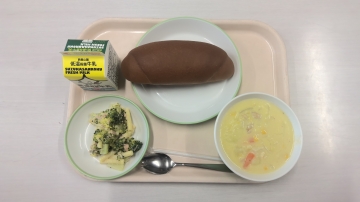 その後学級閉鎖のクラスは増えていませんが、近隣の小中学校ではインフルエンザがまだ猛威をふるっており、油断はできない状況です。学校では基本的な感染対策を徹底するとともに、給食を静かに食べるなど、感染拡大防止に努めています。下の写真は順に1年生、2年生の給食の様子です。机は前向きで、飛沫が飛ばないように、静かに食べていました。今日の給食は、コーンクリームシチュー、ブロッコリーサラダ、黒糖パン、牛乳でした。みんなおいしそうに食べていました。