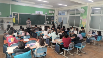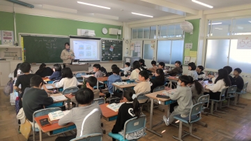 本日5年生の総合学習の一環で防災教室を実施しました。地域の方々にゲストティーチャーとして来ていただき、地震や水害などの防災について学習しました。