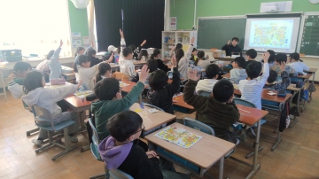 まず3時間目には、講師の先生に地震や水害の話を実体験を交えてしていただきました。台風で水路に流されそうになった実体験の話では、具体物も用意していただき、その恐ろしさを子どもたちが感じることができました。