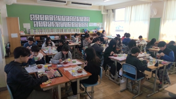 ビビンバと豆腐とわかめのスープ、牛乳でした。下の写真は順に6年B組、6年A組の様子ですが、給食の思い出に浸りながら、みんな楽しくおいしそうに食べていました。