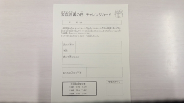明日は「家庭読書の日」とさせていただており、本日「家庭読書の日チャレンジカード」を配付しました。子どもたちは本を読んで思ったことを書き、家の人から一言書いてもらって提出することになっているので、ご協力をお願いいたします。