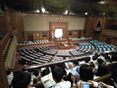 本会議場です。実際に傍聴席に座り、しっかり学習しています。