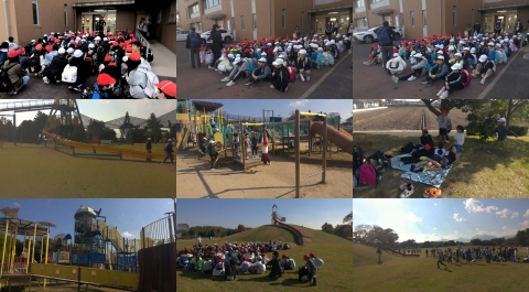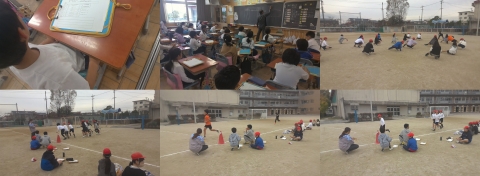 画像は,中心にある点(バケツ)に向かって,玉入れをするときに,みんなが同じ条件になるように,どこの場所にするとよいかを話し合っているところです。