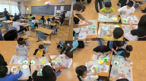 紙皿の中心部を切り取ったものを素材にし,そこに,緑,黄緑,黄の3色の絵の具を,指で思い思いに塗っていく活動をしました。