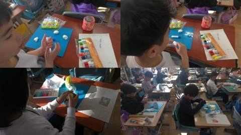 コップのような器は,全員共通していて,そこに色を付けた粘土を着けていきます。