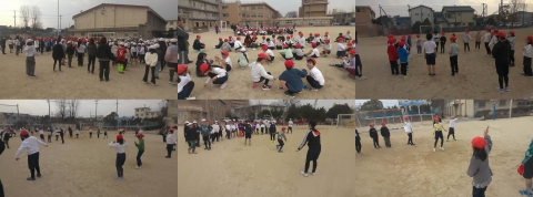 全員で鬼遊びをした後,まず,短縄でいろいろな跳び方に挑戦しました。