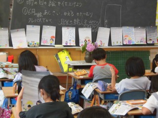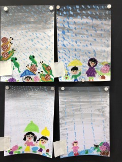 図工では雨の日も楽しい日にしたいという思いも込めて絵の具を使い、水の量を調整しながらすてきな作品作りに取り組んでいます。雨の日は、いろいろな活動ができなくなり、つい暗い気分になりがちですが、何かすてきなことを見つけると1日が楽しいものになりますね。