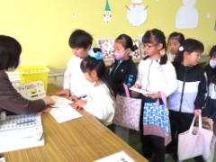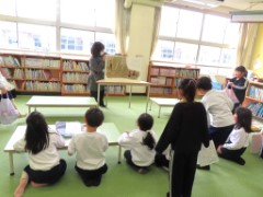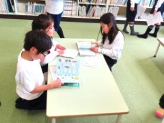 校内作品展と、1年生の授業の様子を見学した後、図書室で絵本の読み聞かせをしました。