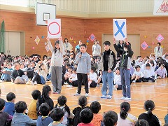 校舎の名前や遠足のこと、先生の名前、1年生の人数等、富洲原小学校のことがわかるクイズでした。