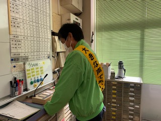 ↑ 登校指導の恰好そのままで行っています。「大きな声であいさつ」のタスキは、地域を挙げての取り組みによりつけさせていただいています。