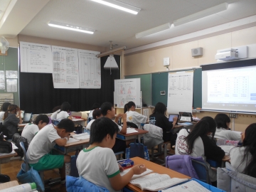 6年生では算数で「データの特徴を調べて判断しよう」の学習をしています。平均値、ドットプロット、ヒストグラム、度数分布表などのさまざまなデータをもとに、根拠を明確にして優勝しそうなクラスを予想します。