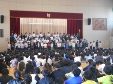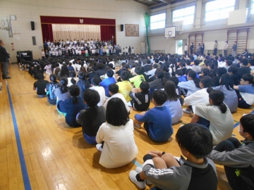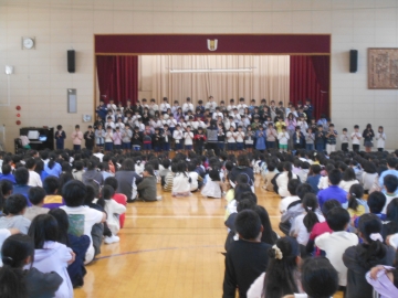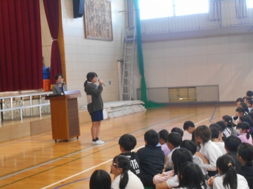 運動会が終わって間もないですが、児童集会を行いました。11月9日に行われれる内部地区文化祭に、4年生が参加し、合奏と合唱を披露します。今日はそのリハーサルでした。500人の客の前で、4年生は堂々とリコーダー演奏と合唱を披露しました。リコーダーの音色はとてもきれいにそろっていて、合唱ではよく声が出ていました。本番が楽しみです。