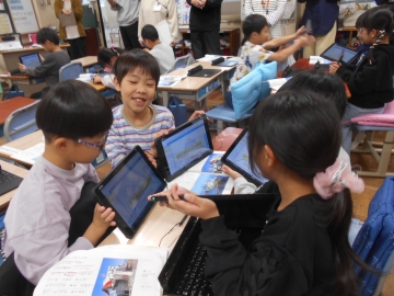 算数では、分数の学習をしています。今日は、帯分数のひき算の学習をしました。どのような計算をするのか、タブレットのホワイトボードを使って考えていきます。インターネットでつながっているので、子どもたちはリアルタイムで他の子のシートを見ることができます。困ったときには、他の子のシートを見てヒントをもらって考えを進めていきます。また、自分の考えを隣の子に説明(アウトプット)することで深めます。