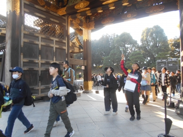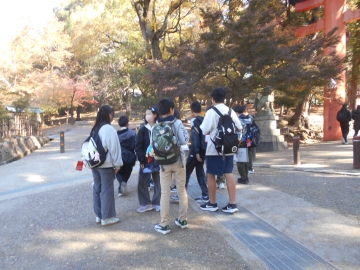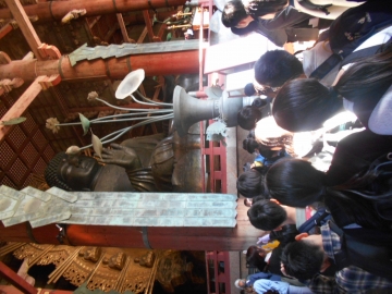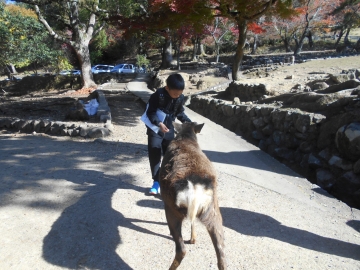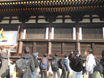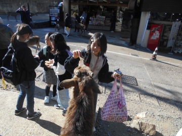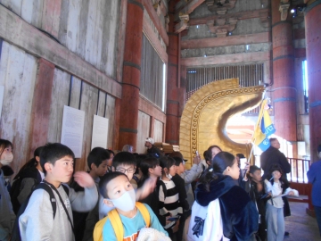 最初に行ったのは、東大寺です。南大門をくぐって大仏殿へ行きました。大仏の大きさに圧倒されていました。大仏を見た後は、奈良公園の中を判別行動しました。初めからミュージアムに行くと決めていた班もいれば、あっという間にゴールの昼食会場に到着している班もいました。鹿せんべいを買って鹿にあげてみるものの、鹿の勢いに驚いて大騒ぎでした。