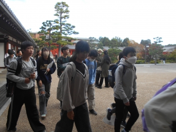 昼食を食べた後は、京都へ向かいました。京都では、平等院、三十三間堂を見学しました。平等院では、自分の財布から十円玉を取り出して見比べ、「同じや!」と叫ぶ子もいました。三十三間堂では、100体以上ある仏像を一つ一つ見て、「〇〇に似てる。」と言いながら楽しんでいました。