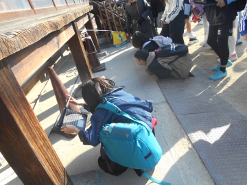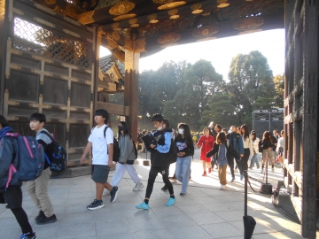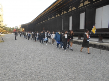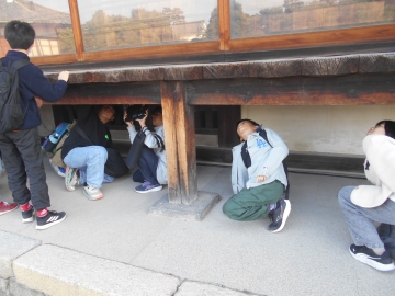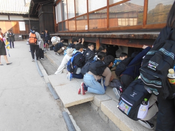 2日目最初の見学地は二条城です。8時45分の開園よりも前に到着。そのおかげで、混雑を回避することができました。開園まで、子どもたちはとても静かに並んで待つことができました。これは内部東小学校生の自慢です。まずは建物の中を歩き、うぐいす張りの音を体感した後、外に出て廊下の下に潜り込んでその仕組みの学びました。