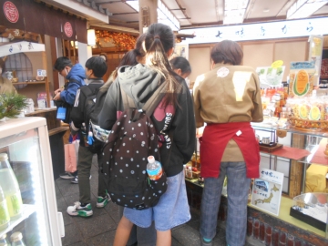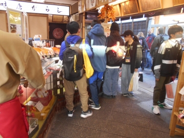 1日目の最後の清水寺を参拝した後は、清水坂で買い物を楽しみました。子どもたちは、家族等にお土産をいっぱい買っていて、嬉しそうに買ったものを見せてくれました。